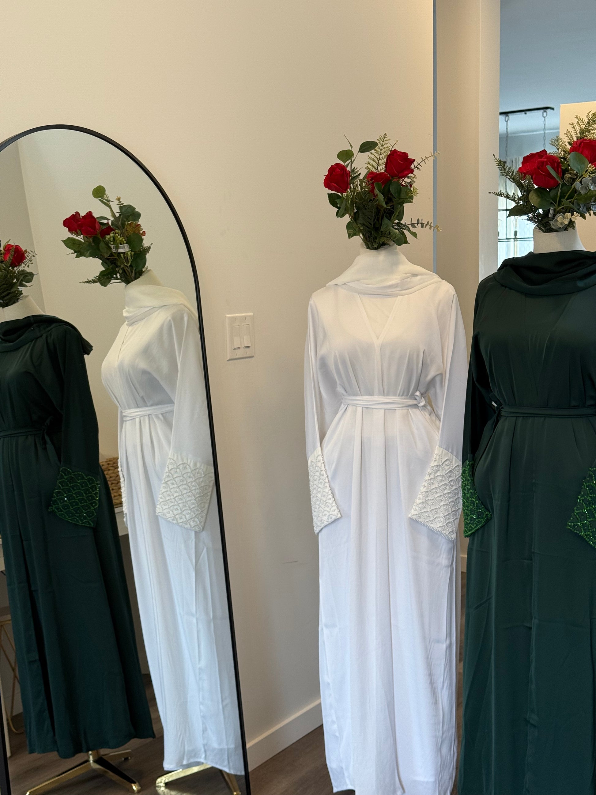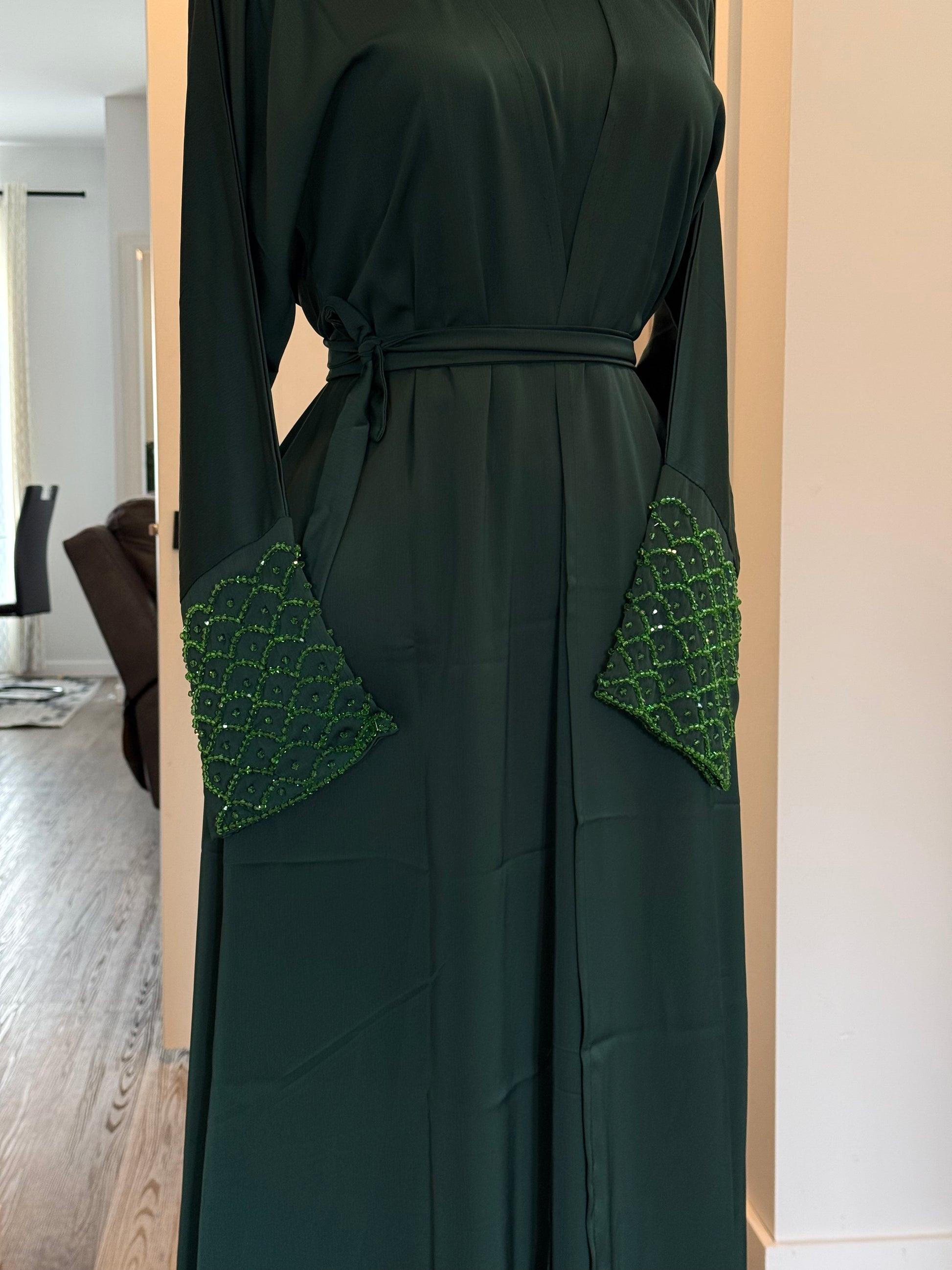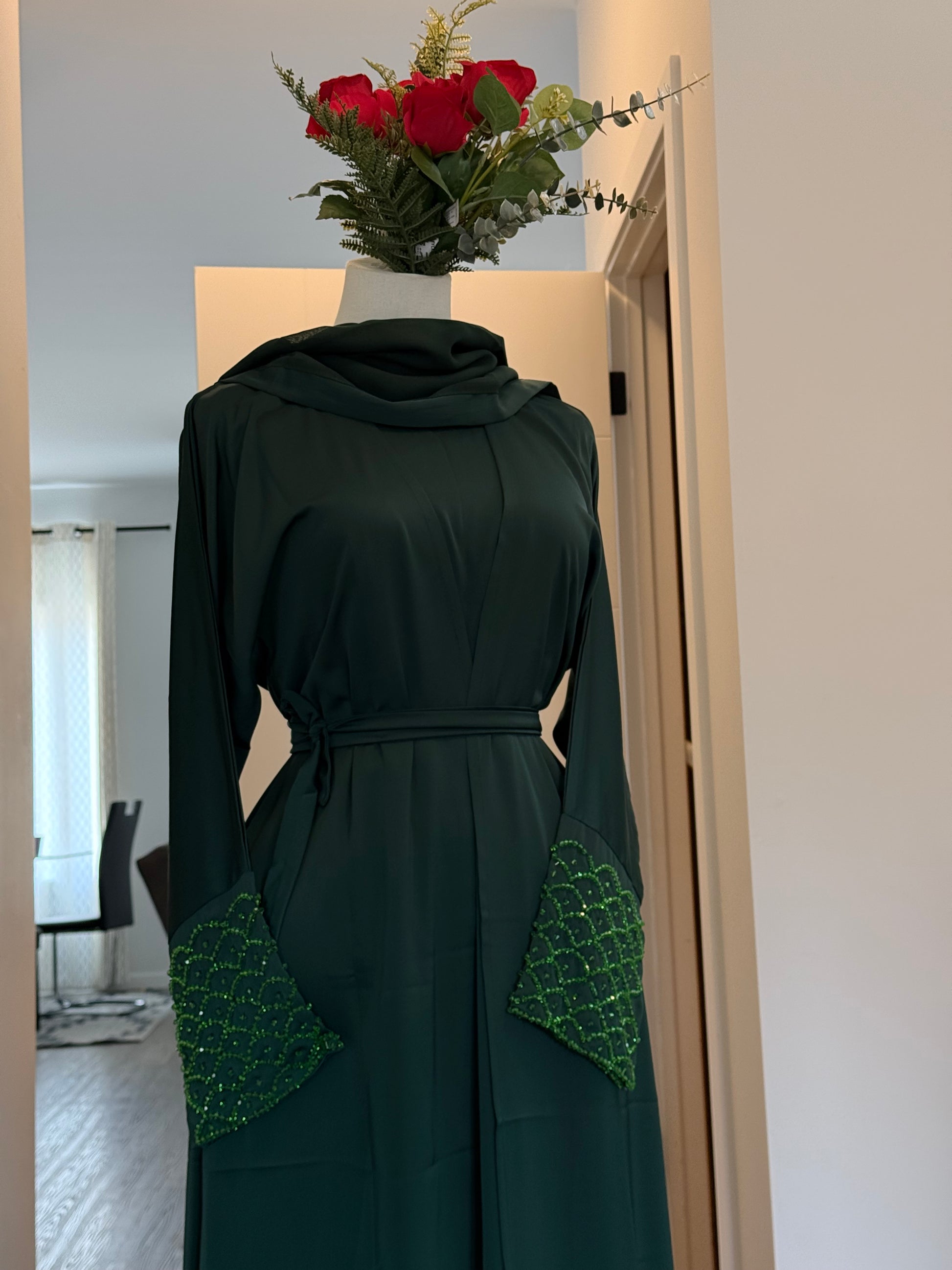 The product consists of an Abaya, an inner, a scarf, and a belt.
